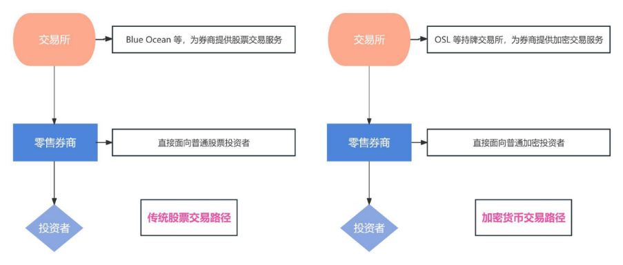 一言以蔽之,加密交易流程中的 OSL 等持牌交易所,恰似美股交易流程中的 Blue Ocean,相较于券商而言,均处于上游角色: