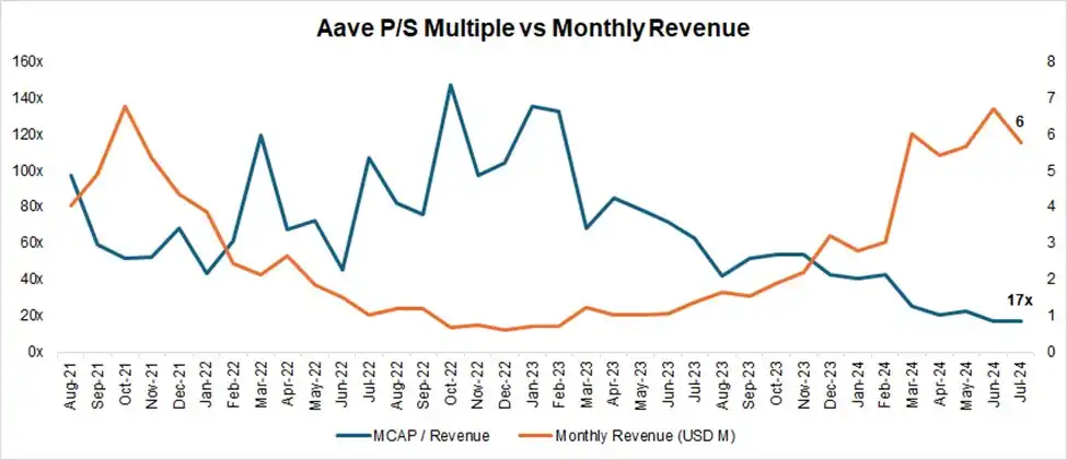 尽管过去几个月 Aave 的各项指标强劲复苏,但其市销率(P/S)仍然低迷,目前为 17 倍,已跌至三年来的最低水平,远低于三年中位数的 62 倍。