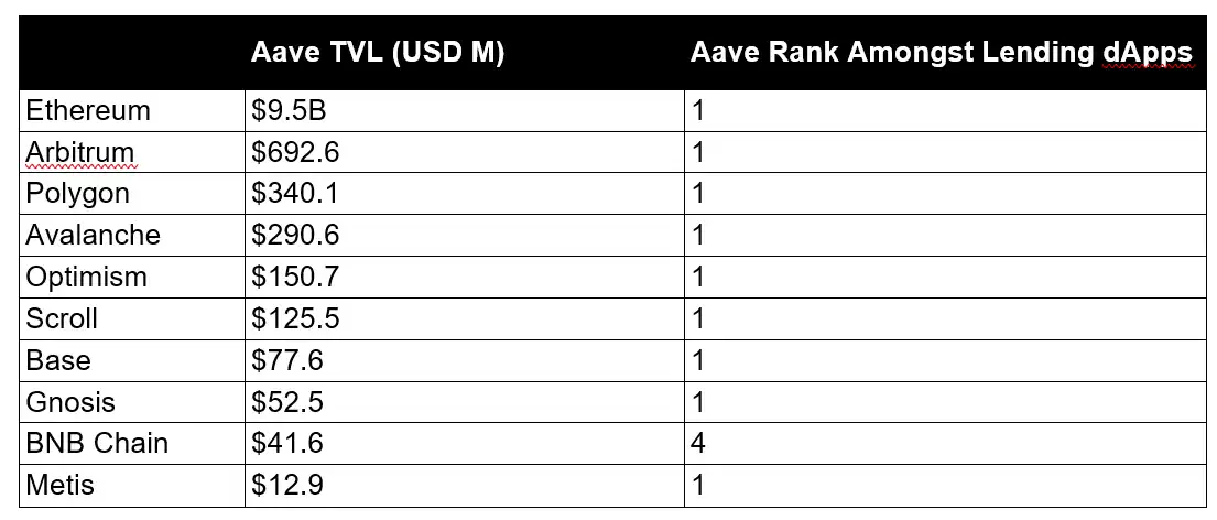 多链生态系统定位:Aave 部署在几乎所有主要的 EVM L1/L2 链上,并且在除 BNB Chain 之外的所有部署链上,其 TVL(总锁仓量)都处于领先地位。在即将到来的 Aave V4 版本中,跨链流动性将得到连接,使得跨链流动性的优势更加突出。详情见下图: