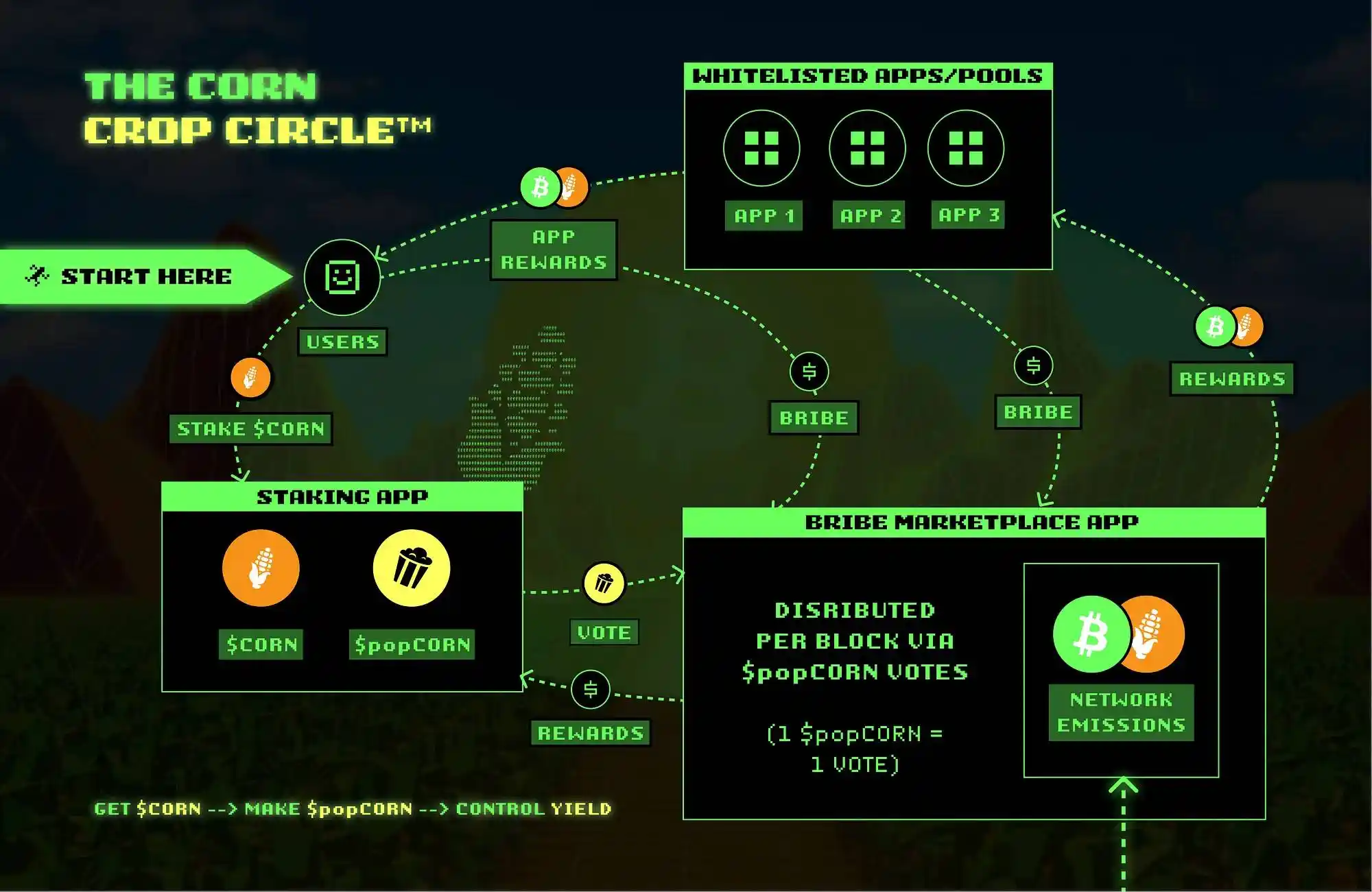 Bribe Marketplace: Corn 对 ve 模型的创新扩展。在 Curve 生态中,已经出现了非正式的"贿赂"市场,而 Corn 似乎将这一概念正式化并集成到其平台中。用户可能可以通过$popCORN 来参与这个市场,影响投票或获得额外奖励。