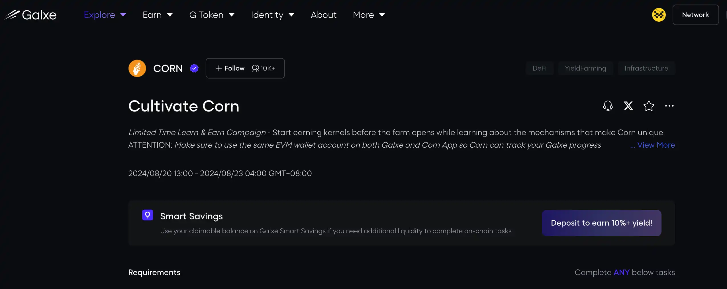 同时,Galxe 上也上线了一个关于 Corn 的社媒传播活动,持续时间为 20 日-23 日,玩家需要简单的关注其推特账号,并点赞和转发相关的帖子即可获得积分,同时加入其 DC 中获得 Farmer 身份。