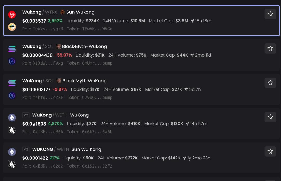 MEME币迎来了惊人的涨幅,根据Dexscreener的数据,发行于Tron上的$Wukong在24小时内涨幅3980%,多个同名MEME币在不同区块链上出现,涨幅各异,ETH上的$WuKong也同样表现不俗。