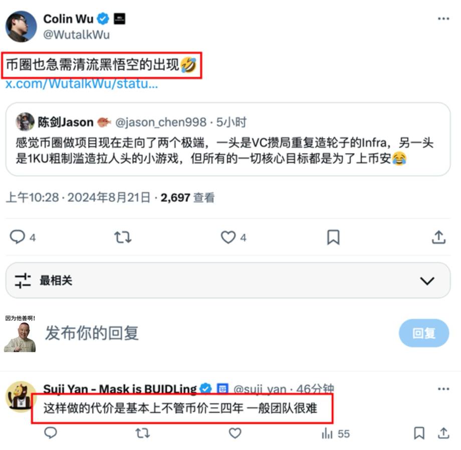 如此迅猛的行情,又一次戳伤Web3人的心,一众项目缺乏价值感,死气沉沉的市场还需要靠这只神猴来带动。没有价值投资的身影,Meme币变成为数不多的流动性,也怪不得会有KOL感慨 “币圈也急需清流黑悟空出现。”