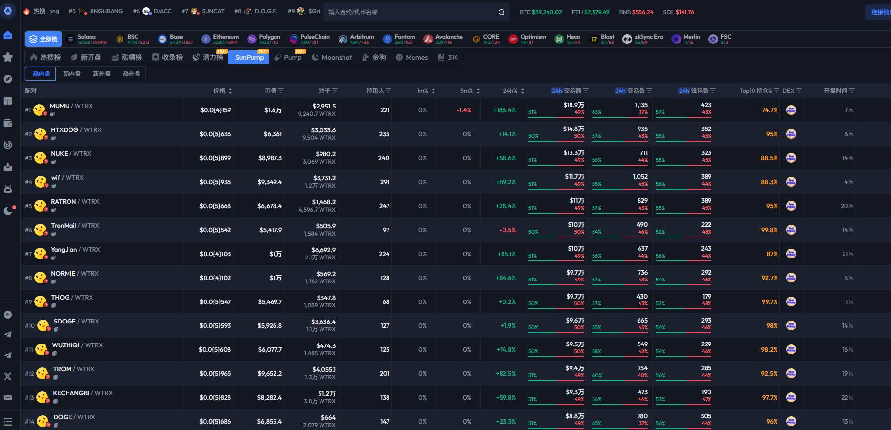 对于扫链来说,最重要的就是一个全面的监控工具的功能都大同小异,主要功能在新资产发行、短时交易量、份额打满上限等关键指标的监控上,应用形式多为「网页版+tg bot」,热门工具主要有 GMGN.AI、BullX、iCrypto 这几个,由于 BullX 目前是邀请码准入制,iCrypto 尚未支持 Solana。所以这里主要以受中文用户欢迎的 GMGN.AI 工具举例: