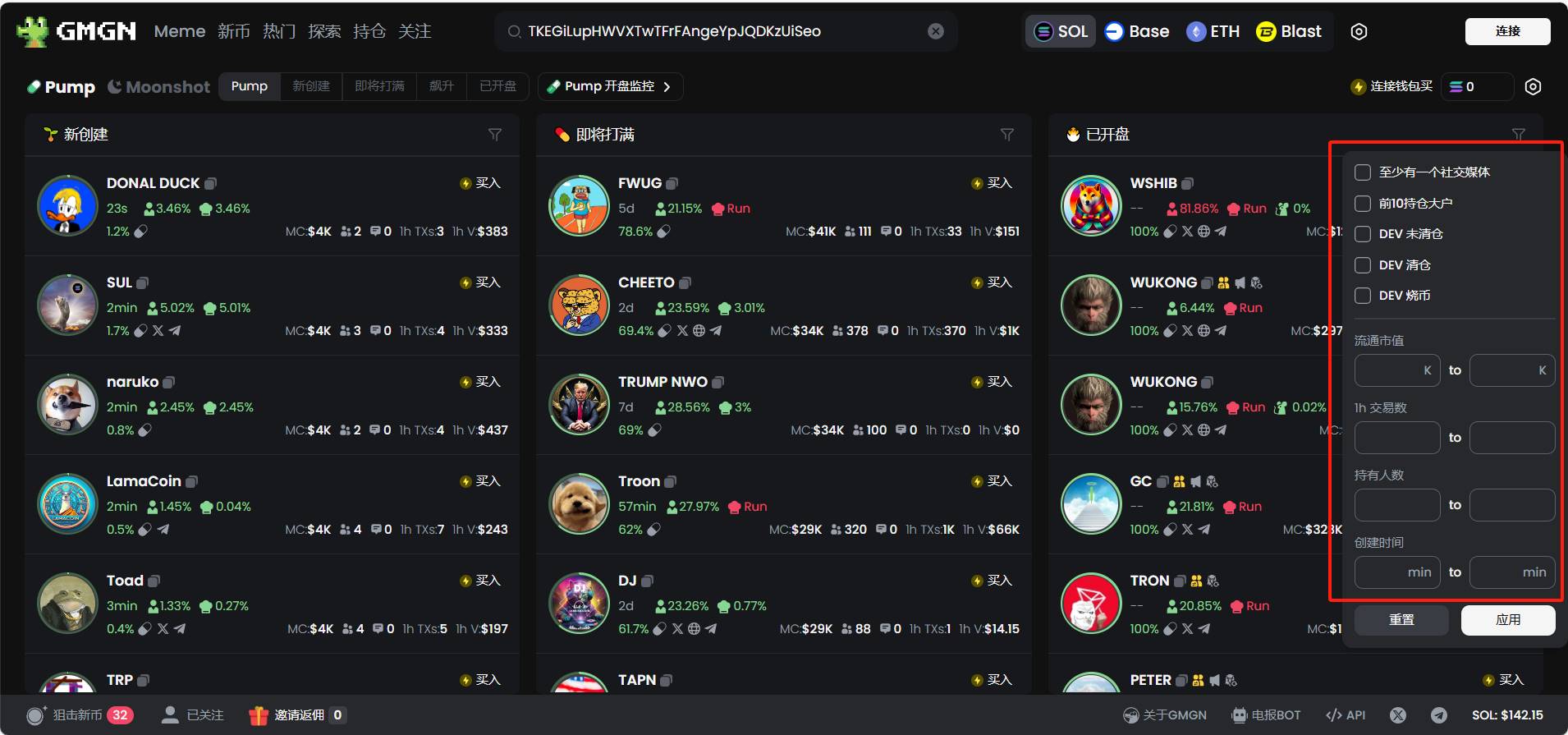 另外,GMGN 支持自定义条件筛选,对社媒账号、Top 地址持仓、Dev 的动作等、交易量、创建时间等指标可以定制筛选。