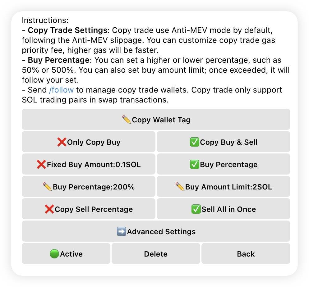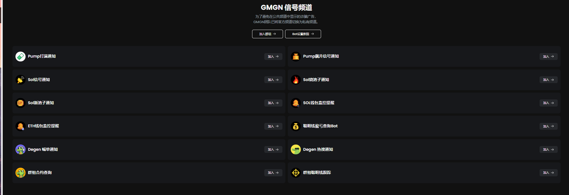 前文提到 GMGN.AI 是「网页版+tg bot」形式,除了实用的网页工具,其 TG Bot 覆盖的范围也比较全面,支持各种监控与交易形式,支持中文。