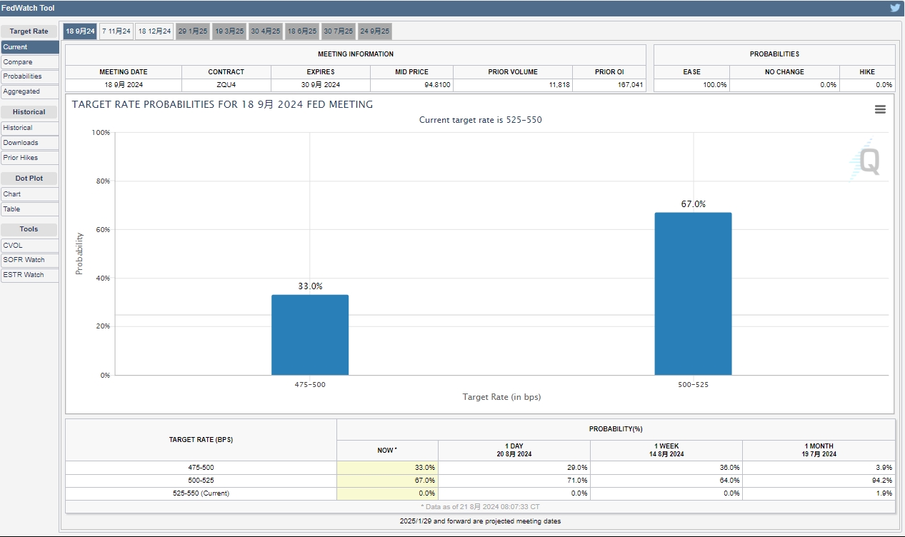消息,8 月 22 日,据 CME「美联储观察」数据,截止发稿,美联储 9 月降息 25 个基点的概率为 67%,降息 50 个基点的概率升至 33%。