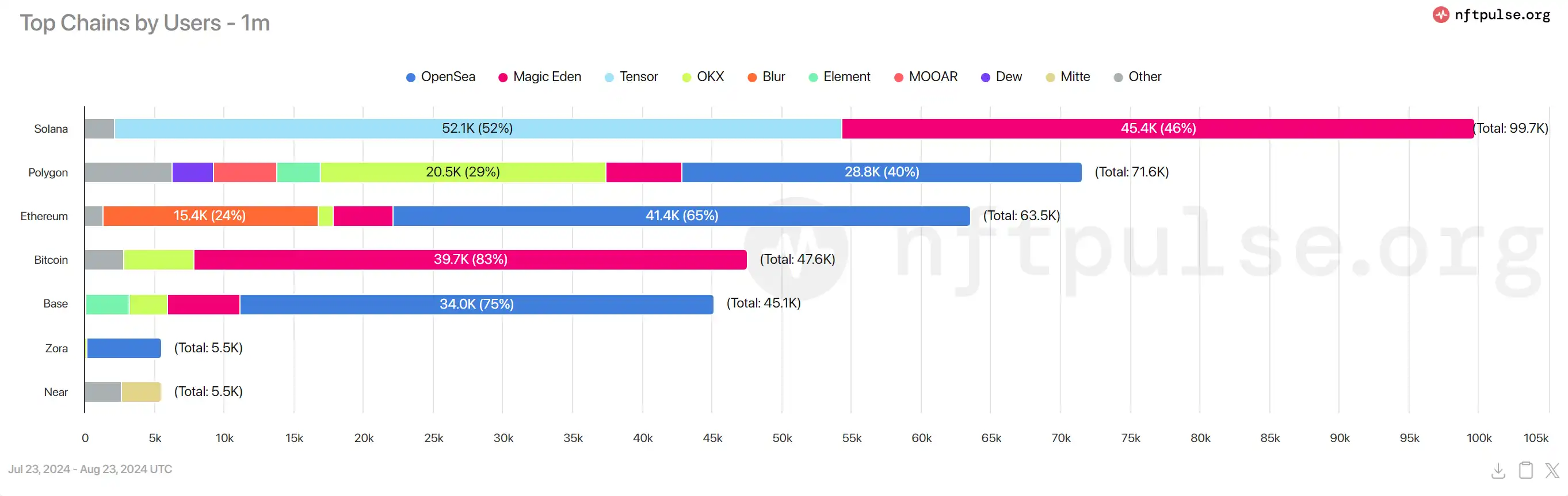但看一下各链的活跃用户占比,Magic Eden 占据了「最活跃的现在」Solana 以及「最有希望的未来」Bitcoin。