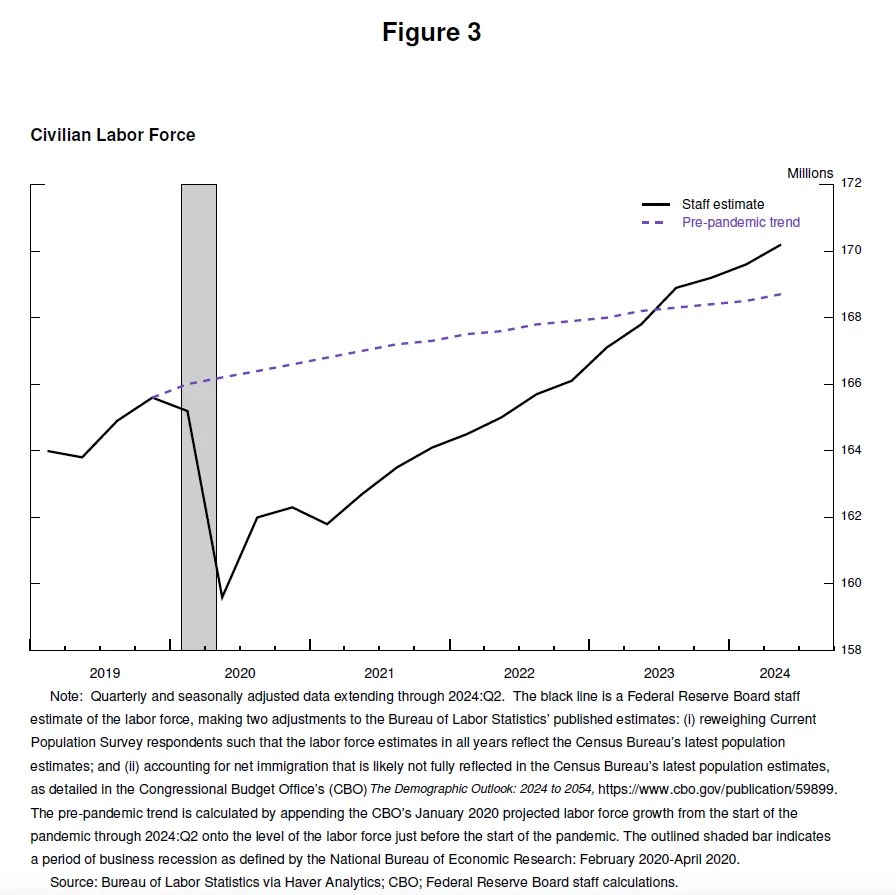 疫情也对供应状况造成了严重破坏。疫情爆发之初,800万人退出了劳动力市场,到2021年初,劳动力规模仍比疫情前减少了400万。劳动力规模直到2023年年中才恢复到疫情前的趋势。