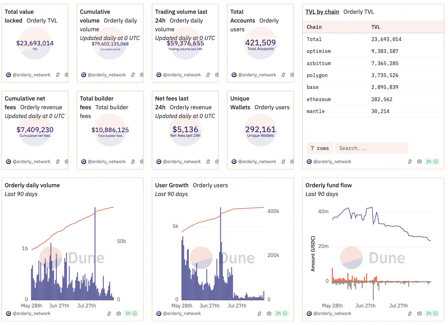 截至目前数据统计,Orderly-Chain 已处理超过 796 亿美元的交易量,独立钱包数量达到 292,161 个,Orderly 支持的 DEX 总账户数达到 421,509 个。Orderly 上的开发者已赚取超过 1,088 万美元,而平台本身的收益已超过 740 万美元。未来,这些收益中的 60% 将分配给 ORDER 代币的质押者。