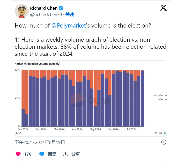 以加密货币为中心的投资公司 1confirmation 的普通合伙人 Richard Chen 在 X 上分享了选举市场与非选举市场的每周交易量图表。他说:「自 2024 年初以来,88% 的交易量与选举有关。」这表明,有相当多的人使用 Polymarket 进行民意调查,以了解公众共识。