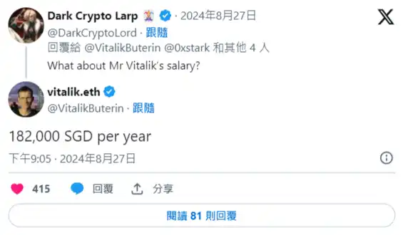 同时,在被一名网友 Dark Crypto Larp 问到人们关心的薪水问题时,V 神也坦然透露,他的年薪为 18.2 万新币(新加坡法币,SGD),约为 446 万新台币。