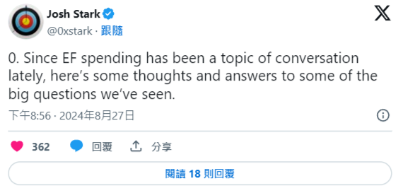 对于 Stark 解释基金会资金资出的状况,以太坊创办人 Vitalik Buterin 也转发表示,EF 所有的关键资讯已经被 Stark 放进了图表中,更多资讯将会在未来被更新。