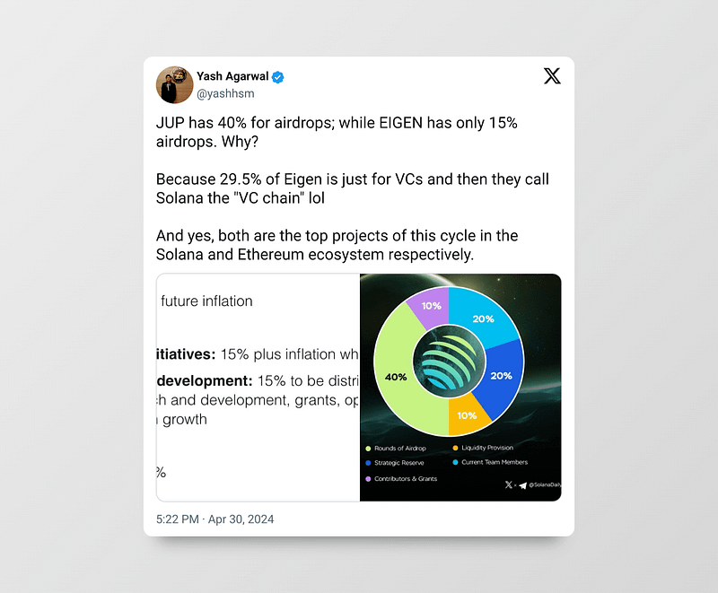以 EigenLayer 为例——这是以太坊上的一个单一项目,筹集了 1.71 亿美元,但仍远未产生任何显著影响,更不用说产生收入。它将使一些风险投资者和内部人士(持有 55% 代币)变得富有。
