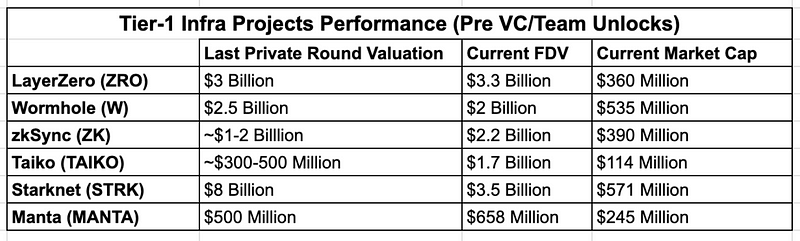 基础设施泡沫已经开始破裂,许多一级基础设施项目在这一周期推出的代币已经低于他们的私募轮估值。