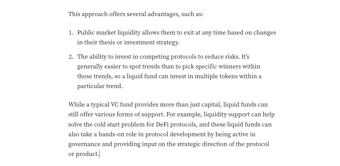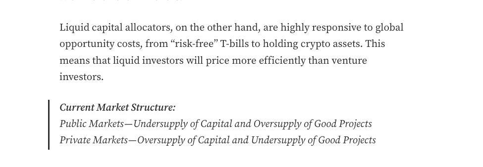 19/ Multicoin 的 TusharJain_ 和 KyleSamani 在 7 年前很好地总结了这一点,他们建议流动基金可以实现两全其美——风险投资经济(投资于年轻代币以获取超额回报)与公共市场流动性相结合。