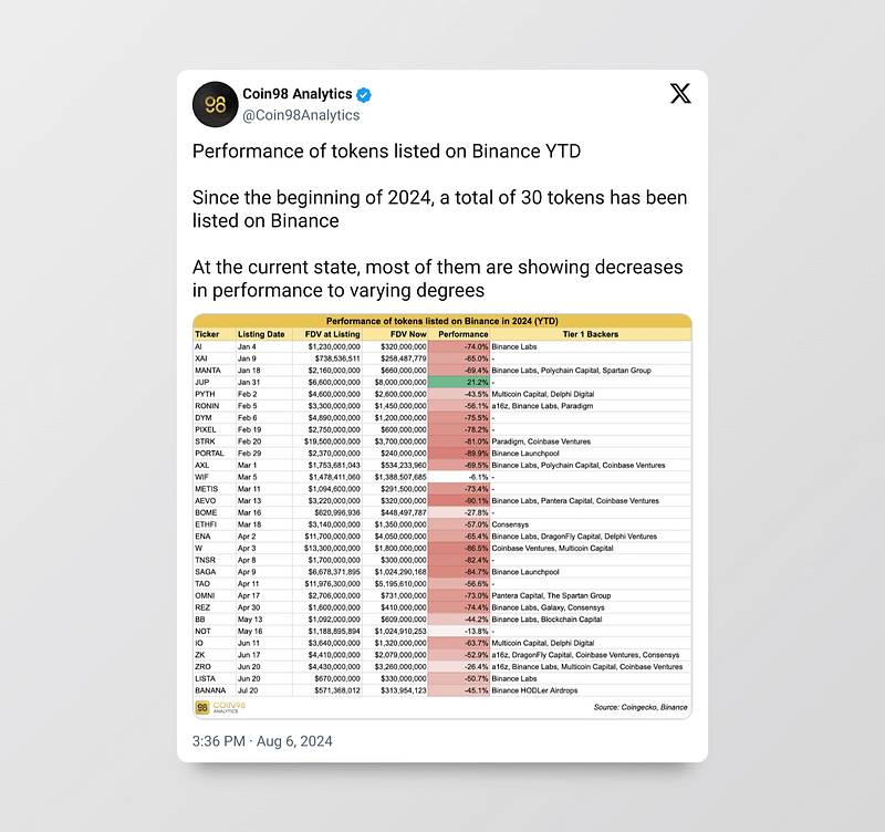 公共市场资本供应不足导致价格发现不良,例如,2024 年前 6 个月推出的所有代币的总 FDV 约为 1000 亿美元,这仅是排名前 10 到前 100 的所有代币总市值的一半。