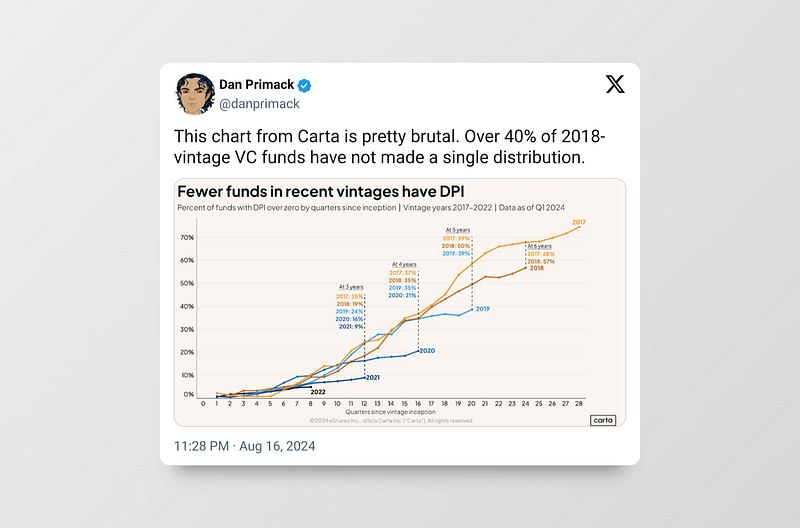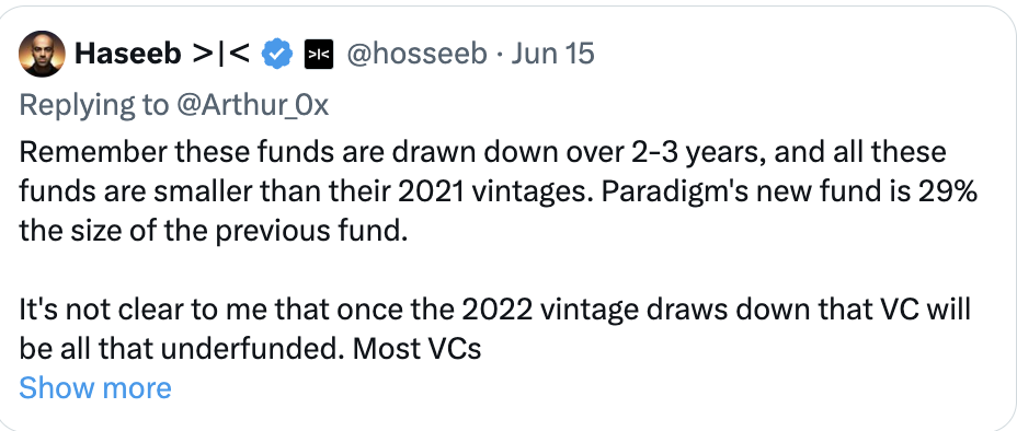 私人风险市场已经在萎缩。即使 Haseeb 也承认这一点——这些基金的规模都小于他们之前的基金,原因显而易见。如果他们能够,Paradigm 将会筹集到 100% 的之前基金的规模。