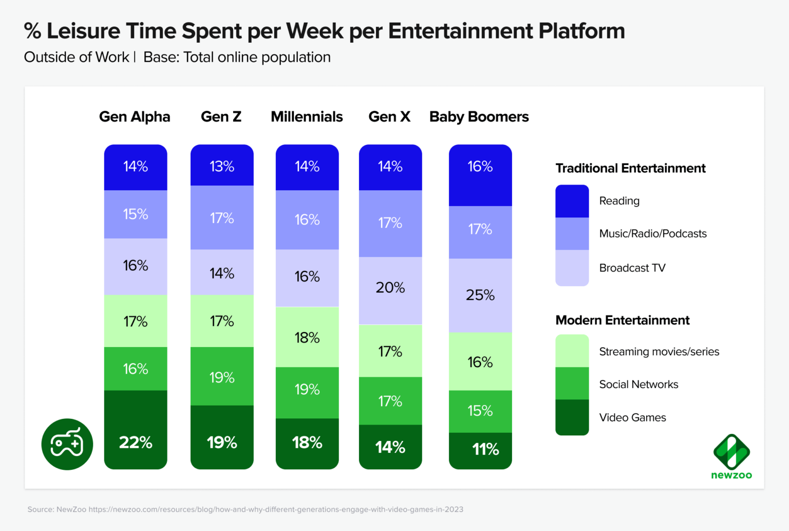 在过去的 30 年中,我们看到消费者的转变持续加深,游戏和互动媒体在每一代人中变得越来越受欢迎。对于 Z 世代及更年轻一代,游戏现在是他们花费闲暇时间的首选,胜过了电视和电影。2019 年,Netflix 首席执行官里德·哈斯廷斯曾在一封给股东的信中表示:“我们与 Fortnite 的竞争(并且常常输给它)超过了 HBO。”对于大多数家庭来说,问题是“我们在玩什么”而非“我们在看什么”。