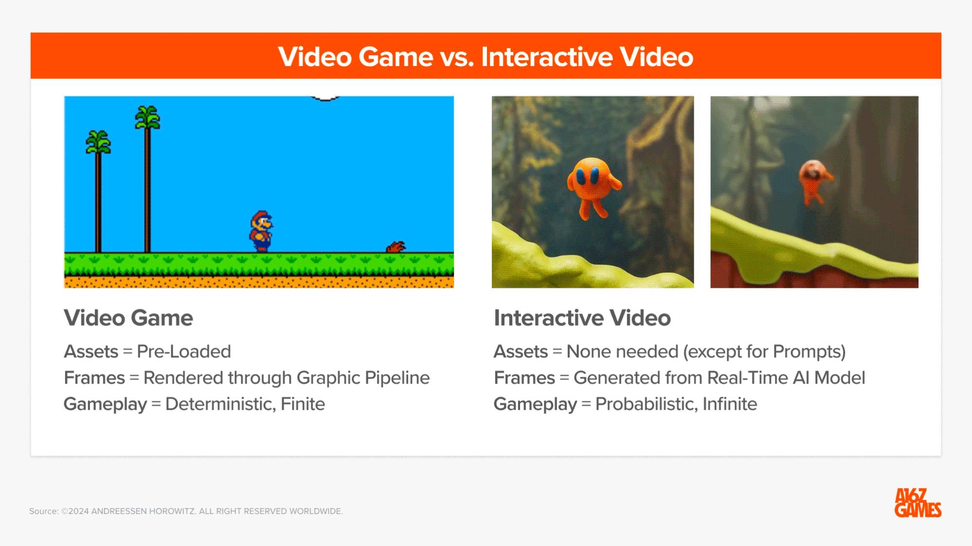首先,什么是互动视频,它与视频游戏有什么不同?在视频游戏中,开发者将一组资源预先加载到游戏引擎中。例如,在《超级马里奥兄弟》中,艺术家设计了马里奥角色、树木和背景。程序员设定马里奥在玩家按下“A”按钮后跳跃 50 像素。跳跃帧利用传统的图形管线渲染。这导致游戏架构高度确定性和计算性,开发者完全控制。