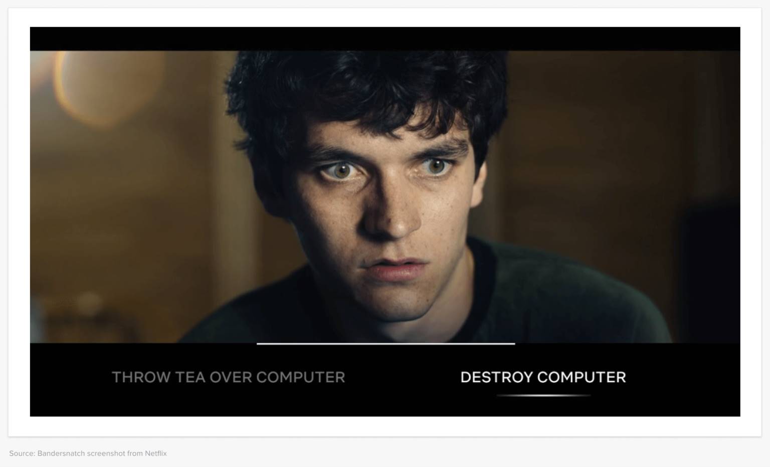 2017 年,Netflix 也进入互动视频领域——从动画作品《猫咪书籍》开始,最终发布了备受好评的《黑镜:潘达斯奈奇》,这是一部真人电影,观众为一位年轻程序员在改编幻想书籍为视频游戏的过程中做出选择。潘达斯奈奇成为假日现象,吸引了一批狂热粉丝,他们制作流程图以记录电影的每一个可能结局。