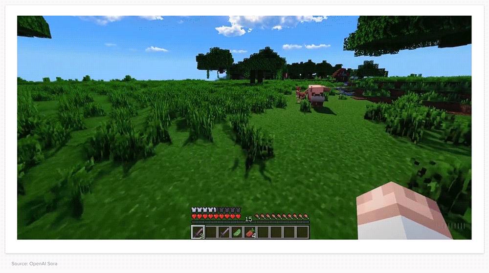 今天,我们看到微软研究和 OpenAI 等参与者在研究领域取得了进展,致力于互动视频的端到端的基础模型。微软的模型旨在生成完全“可玩世界”的三维环境。OpenAI 展示了 Sora 的一个演示,该模型能够进行“零样本”的 Minecraft 模拟:“Sora 可以同时控制 Minecraft 中玩家的行动,高保真度地渲染世界及其动态。”