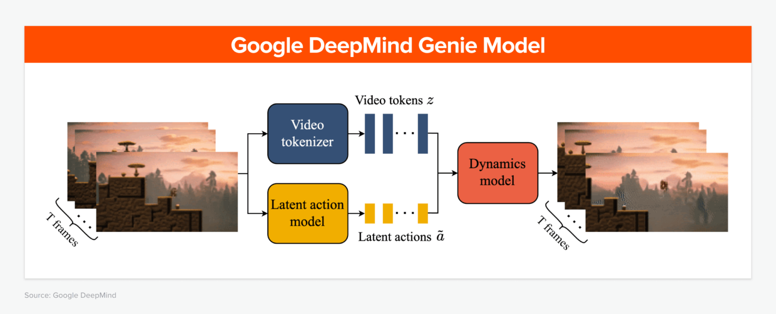 在 2024 年 2 月,Google DeepMind 发布了其自己的端到端互动视频基础模型 Genie。Genie 的独特之处在于其潜在动作模型,该模型推断一对视频帧之间的潜在动作。通过 30 万小时的平台视频的训练,Genie 学会了识别角色动作,例如如何越过障碍物。这个潜在动作模型与视频分词器相结合,输入到动态模型中,该模型预测下一个帧,从而构建出一个互动视频。