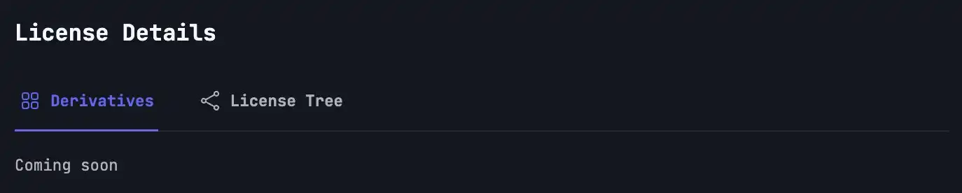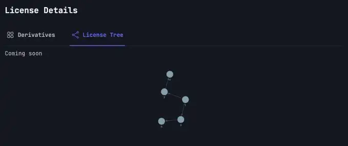另外比较有趣的是授权细节部分中衍生品和 License Tree 的部分,目前这两个功能还未上线,未来应该能够显示有哪些 IP 资产是由这个资产衍生而来,既能追溯到最原始的 IP,又能直观地展示 IP 的延展情况,有完整的链路可追溯后,创作者的权益理论上才会更有保障。