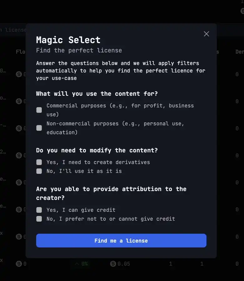 除此之外,点击右侧黄色按钮会出现 Magic Select 选项,这个比较有趣,用户可以根据自己的需求勾选下方的选项,在平台中筛选出符合用户需求的 IP 资产。