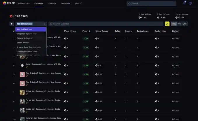 Color 整个平台可以大致分为两个部分,NFT 资产交易和 IP 授权板块。