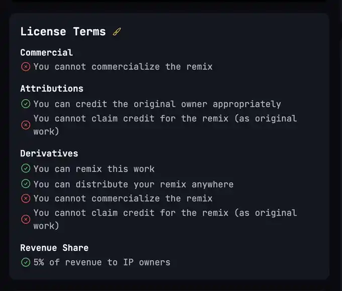 点击进入到 IP 资产详情页后,我们可以看到 IP 授权条款,这些条款对于能否商业化、能否传播、能否制作衍生品、收入分成等等做了基础的声明。