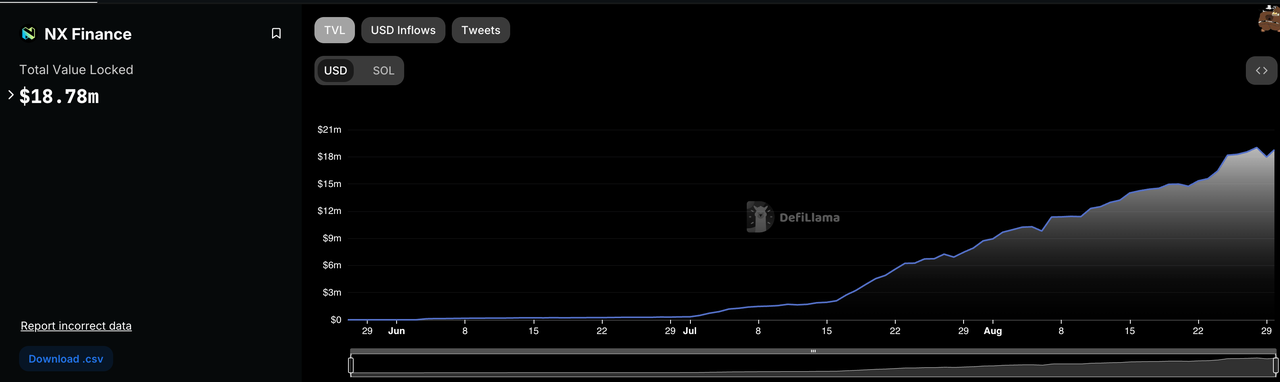 NX Finance 作为 Solana DeFi 生态系统中的收益增强层,积极整合了 Solana DeFi 生态中的优质资产,在过去一个月中,成为 Solana 生态中 TVL 增长最快的项目之一。