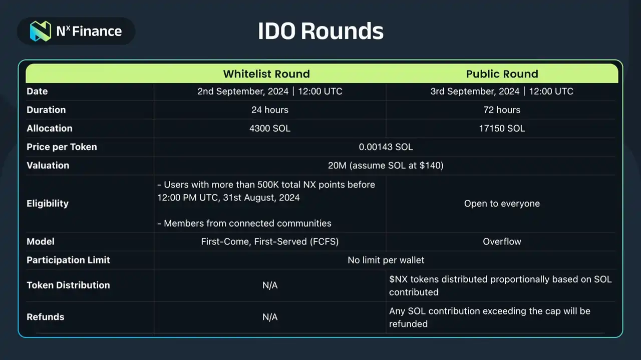 NX Finance 的 IDO 将会分为两轮,分别是白名单轮和公开轮。白名单轮定于 2024 年 9 月 2 日,北京时间 20:00 开始,持续 24 小时。公开轮紧随其后,从 2024 年 9 月 3 日,北京时间 20:00 开始,为期 72 小时。白名单轮与公开轮代币价格相同,都是每枚代币 0.00143SOL,按照每枚 SOL140 美金的价格计算,NX 代币的全流通市值是两千万美金,流通市值为四百万美金。IDO 结束四天后,9 月 9 日 NX 代币正式 TGE。