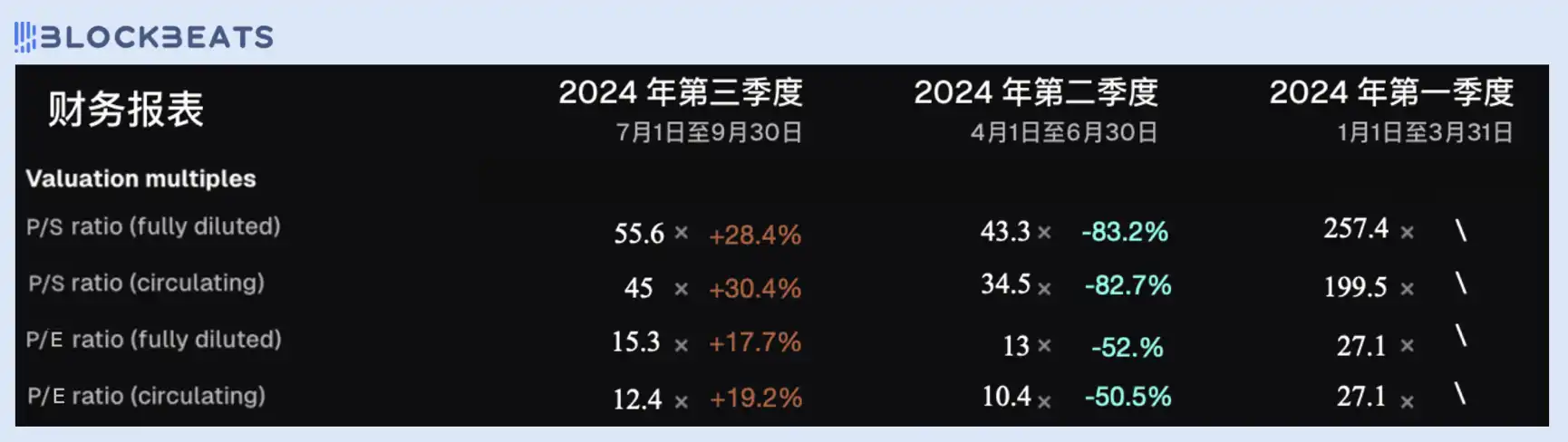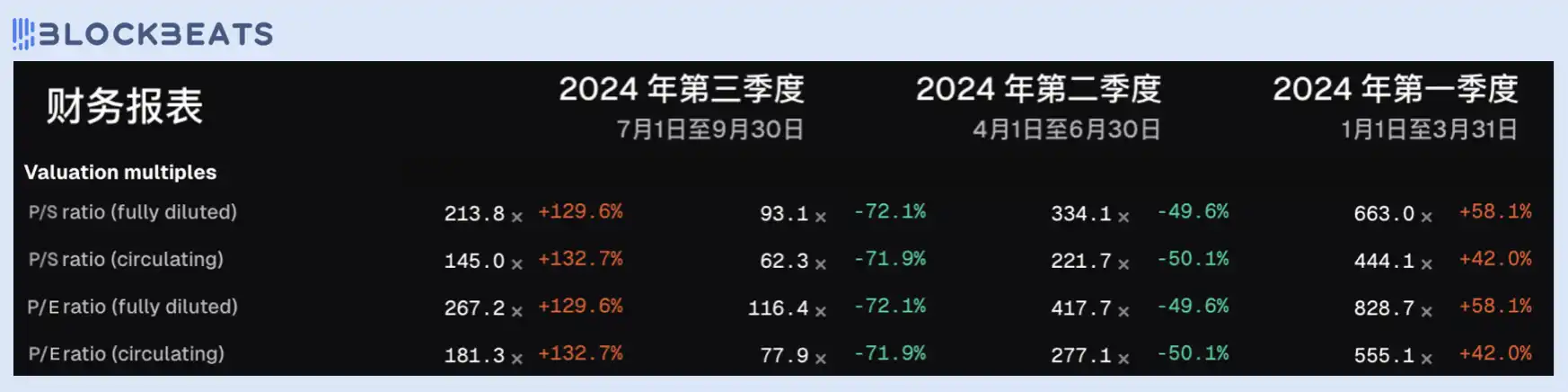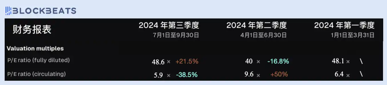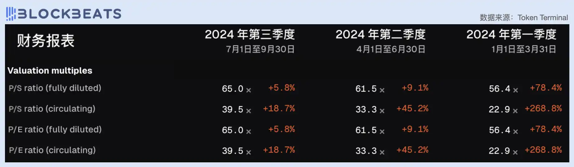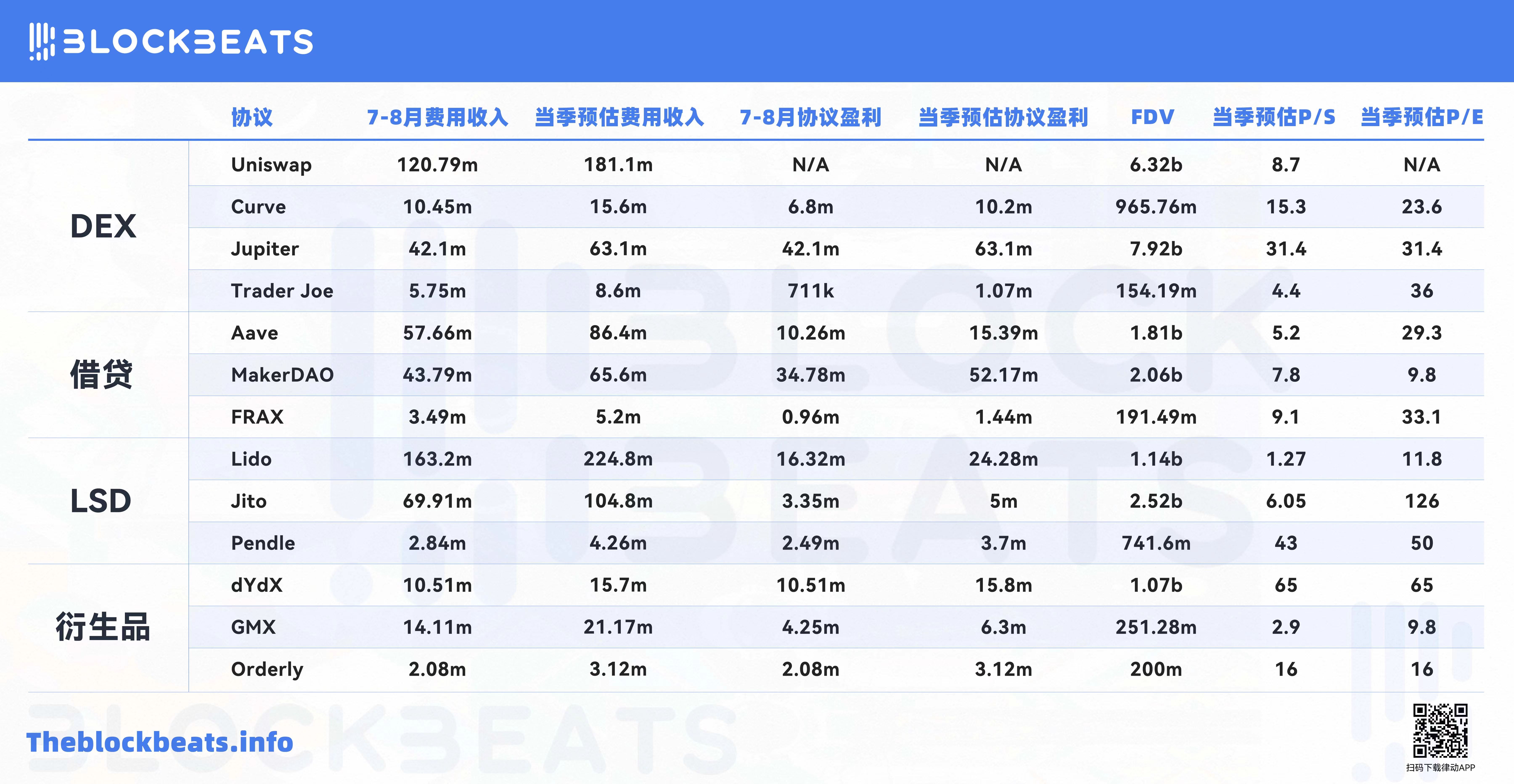 注:在本文中,我们以 P/E 市盈率作为判断协议估值水平的主要指标。其中协议费用收入(Fees)视为营收,以此计算其 P/S 市销率,而协议利润(Revenue)则是在扣除各方利益分配后协议或者 DAO 所得的实际利润,以此计算其 P/E 市盈率。另外,由于第三季度尚未结束,因此当季表现将据 7、8 月数据均值预估。