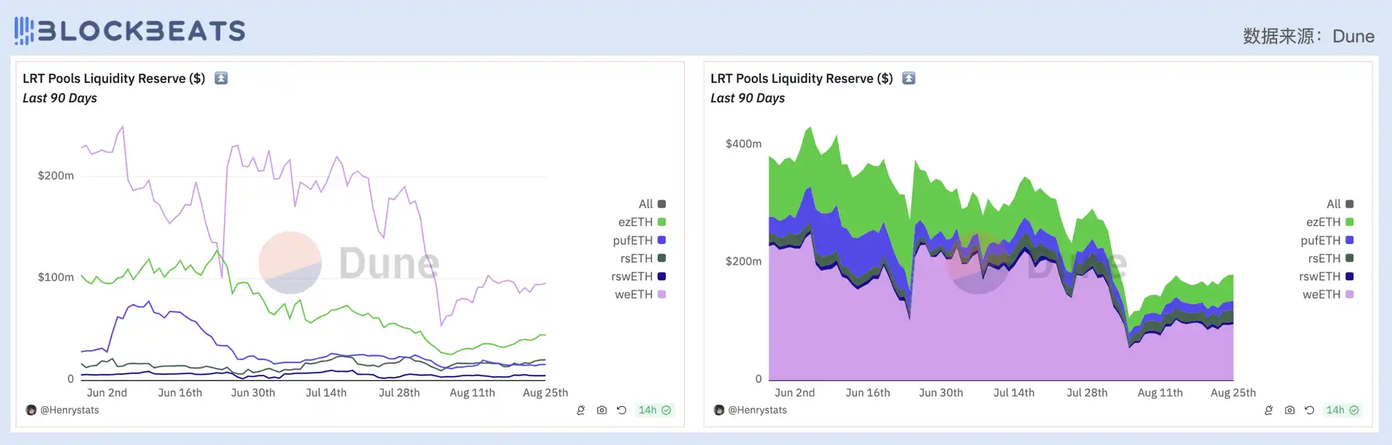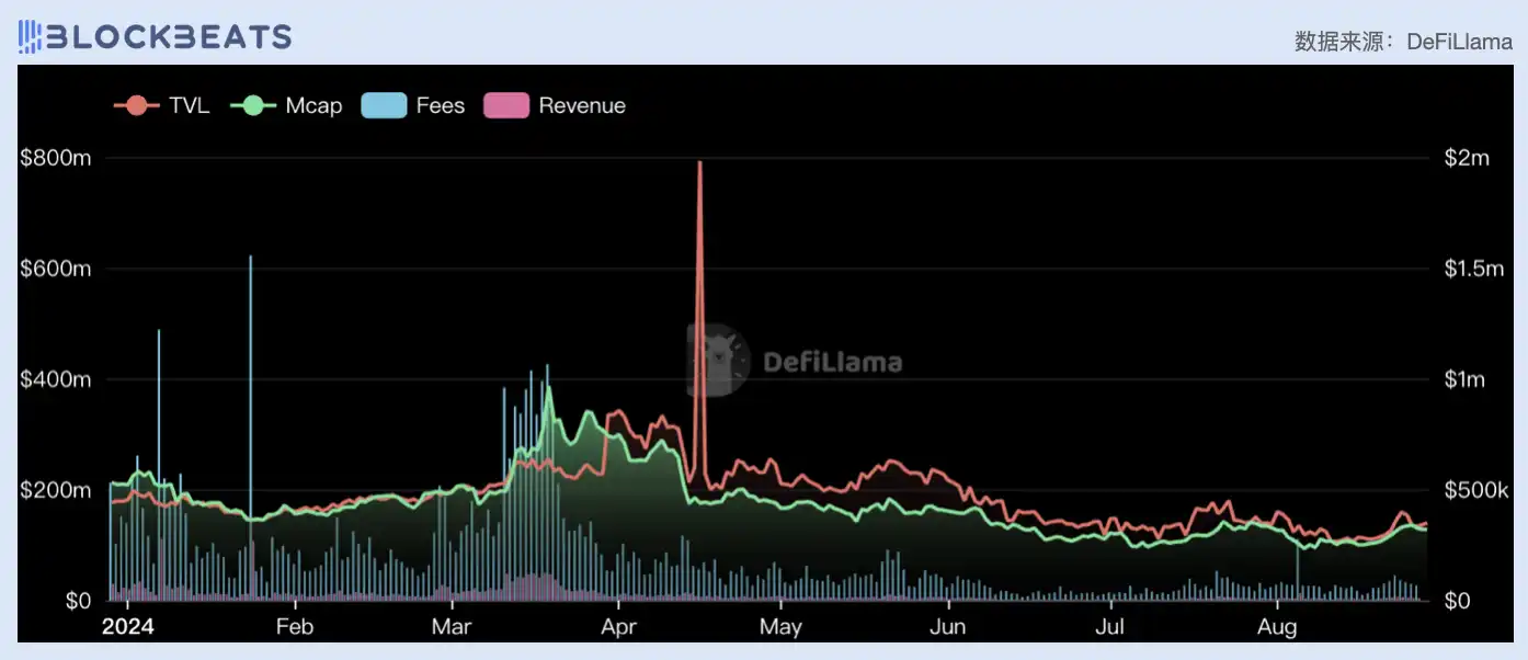 4 月的以太坊质押热潮为 Pendle 带去了巨量的流动性资金,这种繁荣一直持续到六月初。Pendle 上大部分交易都集中在与以太坊及其相关再质押代币上,在这段时间的繁荣体面依赖如 Etherfi、Ethena 和 Renzo 等 LRT 协议的空投激励,这些协议都为 Pendle 上的流动性提供者赋予了 2-4.5 倍的空投积分乘数,也为 Pendle 之后的业务发展埋下了风险。