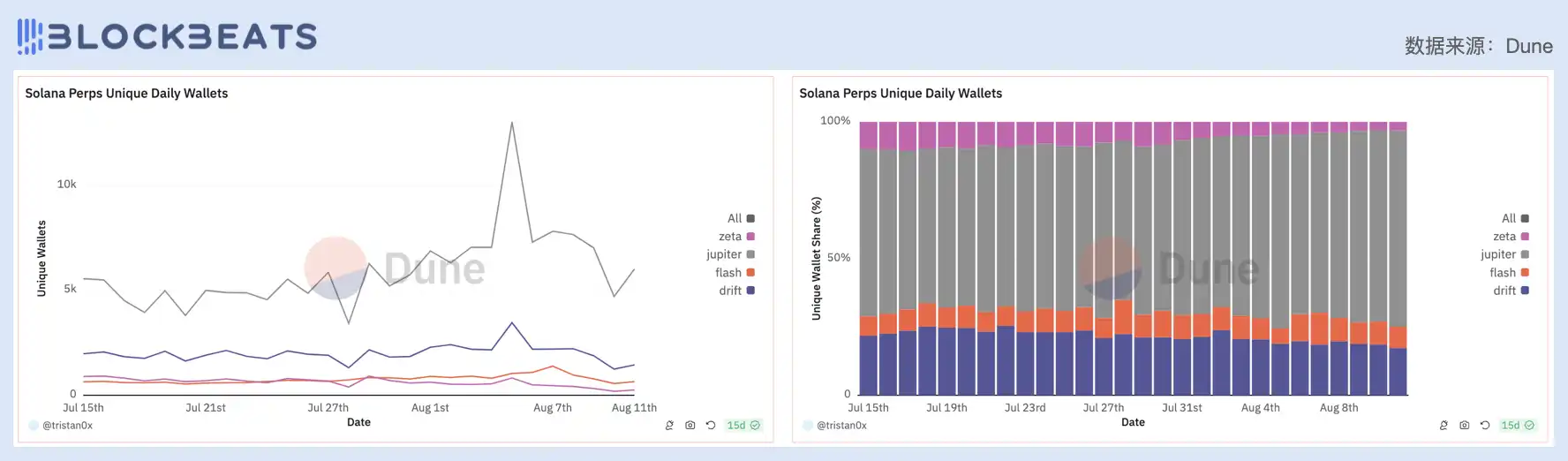 尽管表面上看,Jupiter 的 DEX 聚合业务并不直接产生盈利,但其市占率优势使得 Jupiter 成为 Solana 生态用户进行交易的首选入口。这种流量优势为其 Perps 产品带来大量流量支持。在 Solana 生态的永续合约产品中,Jupiter 的每日独立钱包数量占比超过 70%,远超其他产品如 Drift、Zeta 和 Flash。