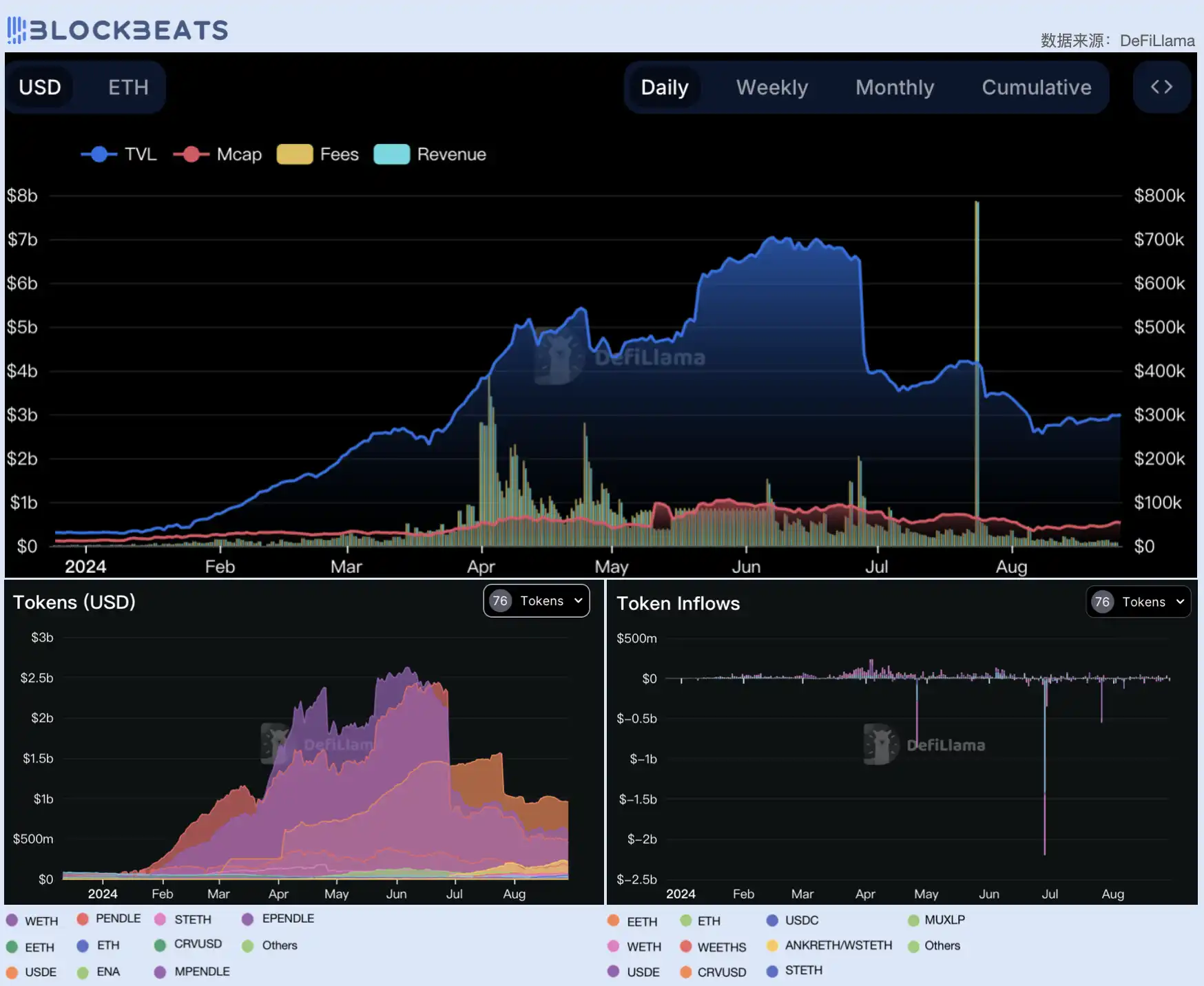 第三季度以来,各个 LST 协议空投结束叠加 Pendle 上多个金融产品到期,为 Pendle 带来了流动性考验。6 月底,Pendle 的 TVL 经历了腰斩式暴跌,从 6 月 27 日的 66 亿美元跌至 7 月 1 日的 39 亿美元,协议收入也随之腰斩。具体来看,6 月 28 日有 13 亿美元的 eETH(Ether.fi 的 LST 代币)和 7 亿美元的 WETH 流出 Pendle,目前 Pendle 上只有 4.45 亿美元的 eETH。