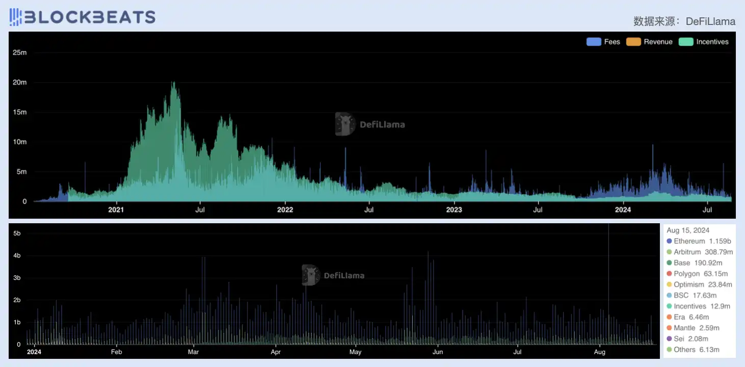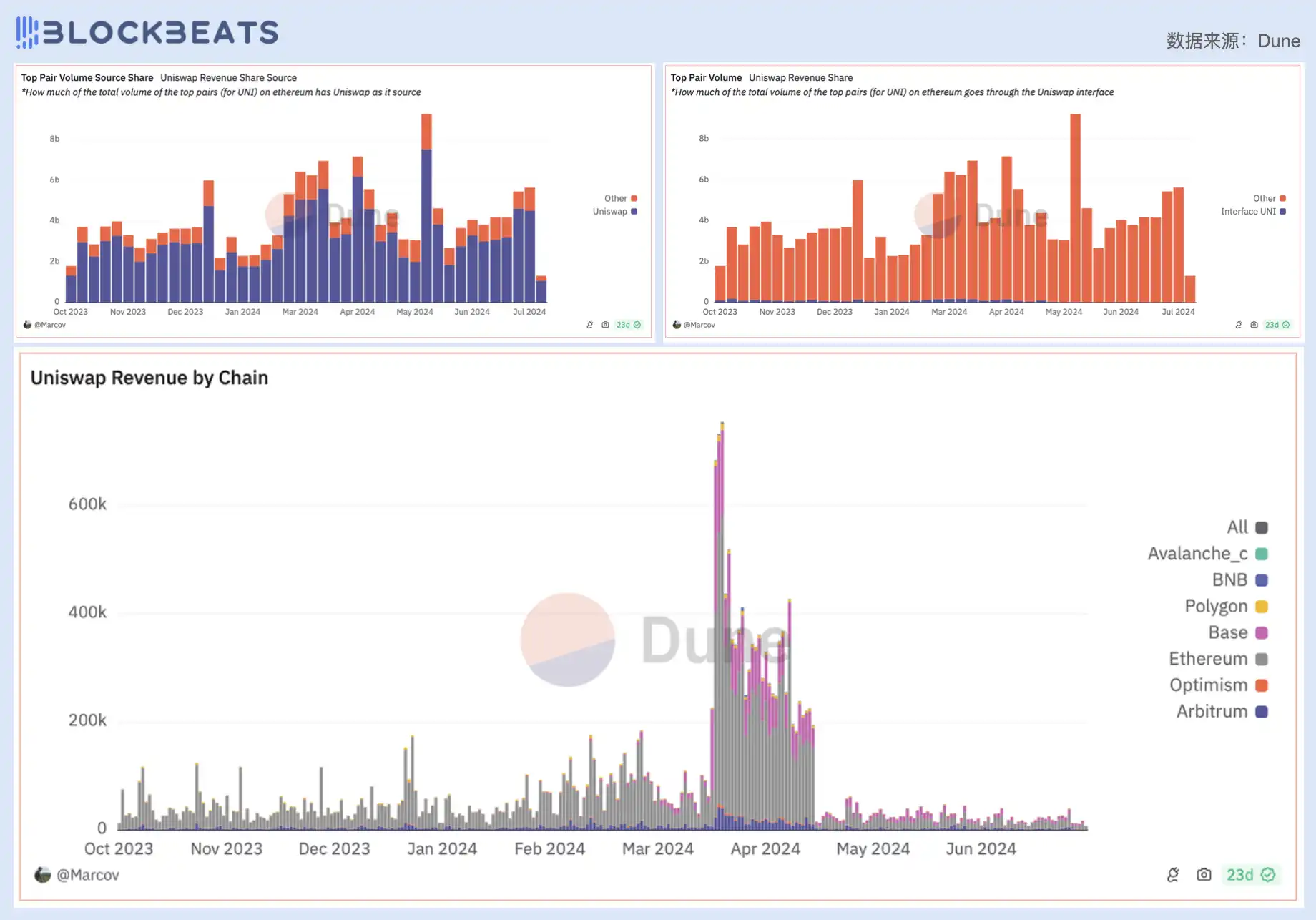 从费用收入的来源看,尽管 Uniswap 团队和社区在过去半年努力推进协议的多链发展,但以太坊主网仍然是协议目前最大的费用来源,交易量仅 8 月 15 日一天就达 11.6 亿美元,其次是 Arbitrum 与 Base,二者交易量总和大致与主网相同。据 CoinGecko 最新报告显示,今年上半年,Uniswap 仍然是 ETH 消耗量最大的应用协议,共计销毁约 71,915 枚 ETH。