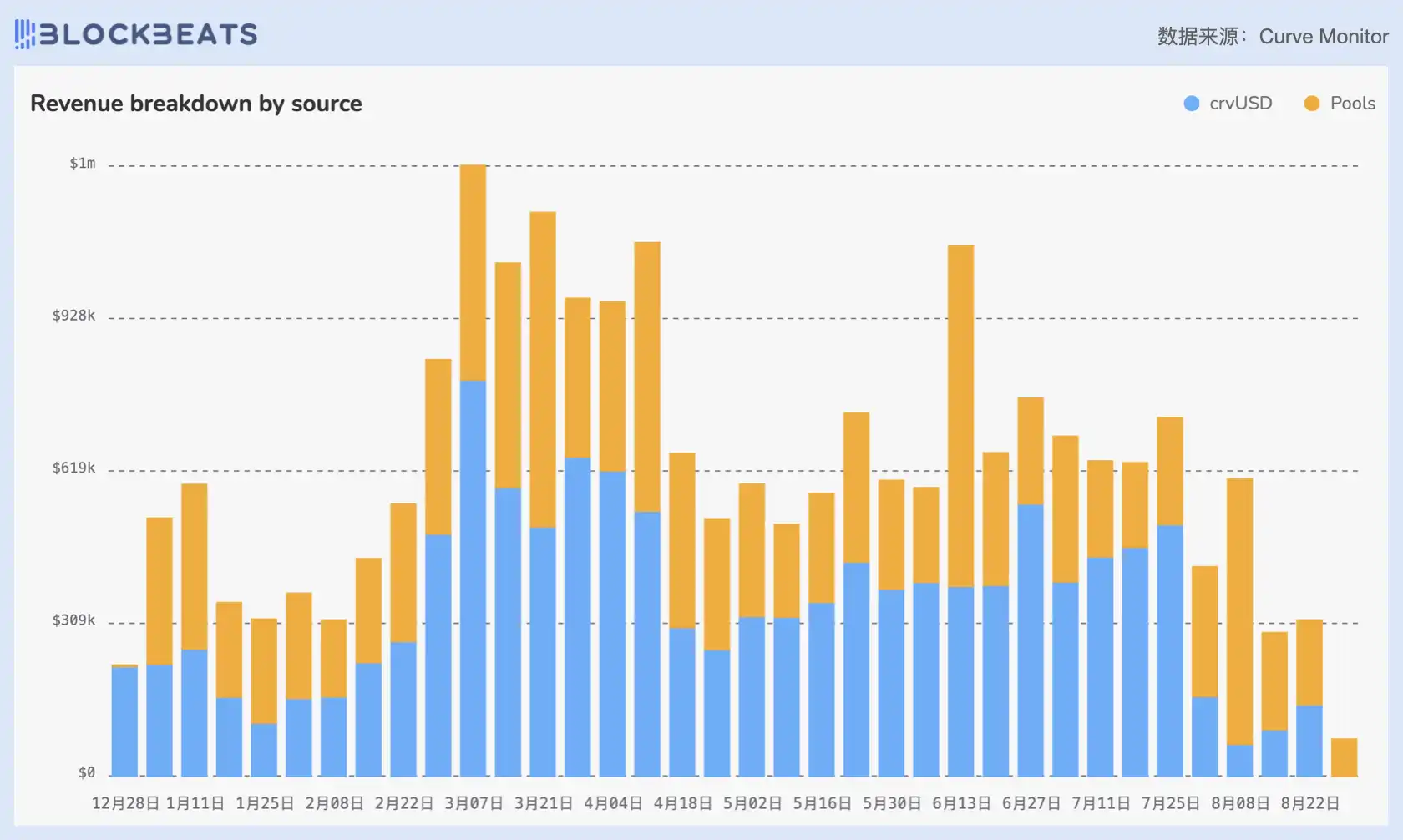 今年 6 月,Curve 改变其费用分配激励机制,从 3CRV 代币过渡到其原生稳定币 crvUSD,以提高 crvUSD 的实用性,增强 Curve 的稳定性和流动性,crvUSD 之于 Curve 的救赎作用曾一度十分明显。从收入渠道看,crvUSD 推出以来一段时间内曾超过 Pool 的收入。但 8 月 5 日,加密行业发生大规模链上清算,致使 Curve 下调 crvUSD 的借贷利率,ETH、WBTC 等池子的利率低至零点几,资金出逃明显。