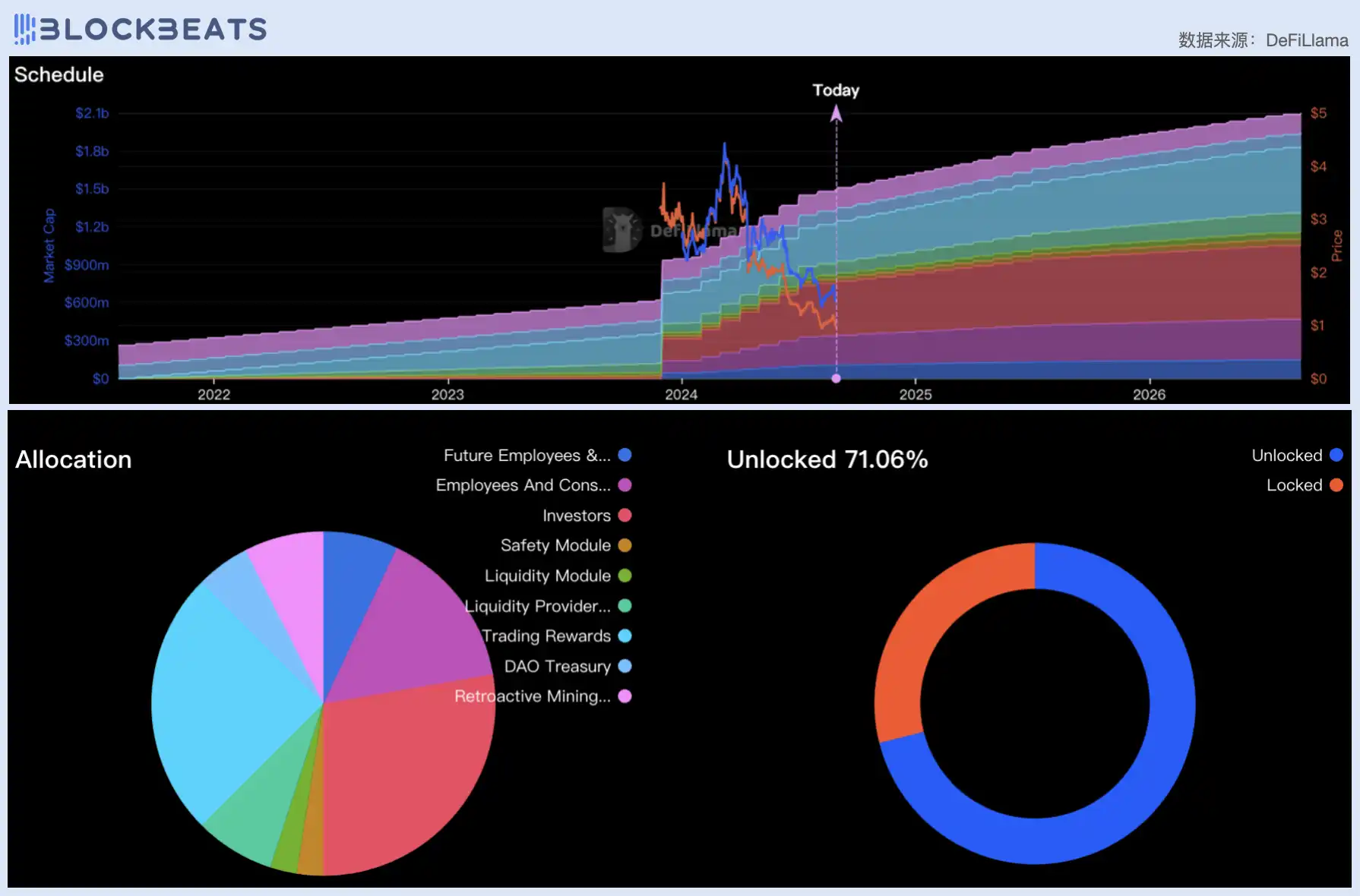 在市场增长受阻之外,代币 DYDX 还面临着大额解锁的抛压。DYDX 自 2023 年 12 月 1 日其开始进行大额筹码解锁,一次性解锁占总供应量的 15%,其余 35% 每月分批次解锁,6 年内释放完毕。这些代币份额主要来自投资者、创办人、顾问及员工,占流通供应量的高达 84.41%。目前,dYdX 还有 71.06% 的代币没有解锁。
