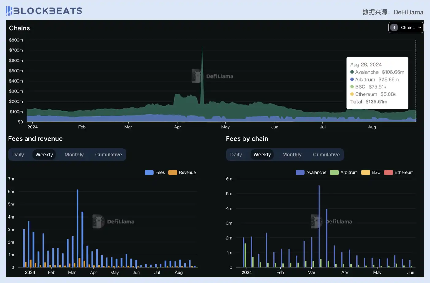 2024 年初以来,Trader Joe 的 TVL 维持在 1.5 亿到 2 亿美元之间,在 4 月至 6 月期间有较繁荣的表现,近一个月 TVL 已经降至 1 亿美元以下。Trader Joe 的 TVL 主要分布在 Avalanche($114.26M) 和 Arbitrum($45.38M),分别占总 TVL 的较大比例,相应的,Avalanche 也是 Trader Joe 的主要的手续费贡献来源,占比大约在 60% - 70% 之间,其次是 Arbitrum,占比 21%。