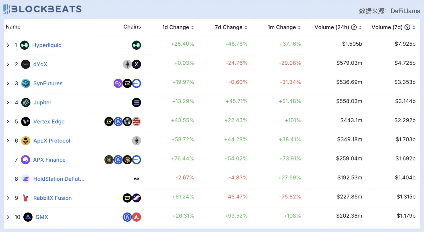去年 8 月,GMX 推出 V2,通过修改费用机制来保持多空持仓平衡,以便降低 GMX 在面临剧烈的市场波动时发生系统性风险的概率。目前交易量主要都集中在 V2,但从 7 日交易量来看,GMX 已经位列衍生品市场第十位。