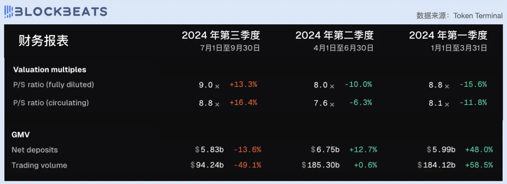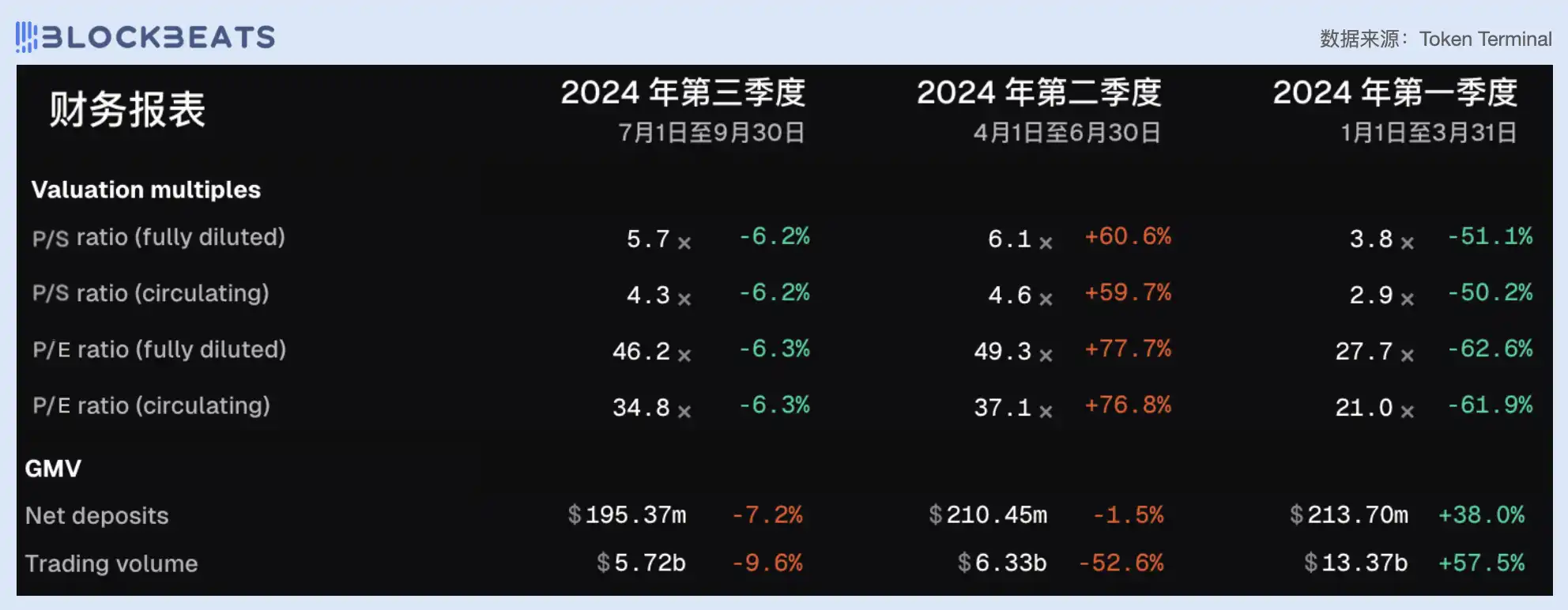 GMX 的 PE 值近三个季度一直小幅下降,维持在 10 左右。GMV 由于第二季度行情较差而表现不佳,截止目前第三季度的 GMV 总额已经超越第二季度总金额。