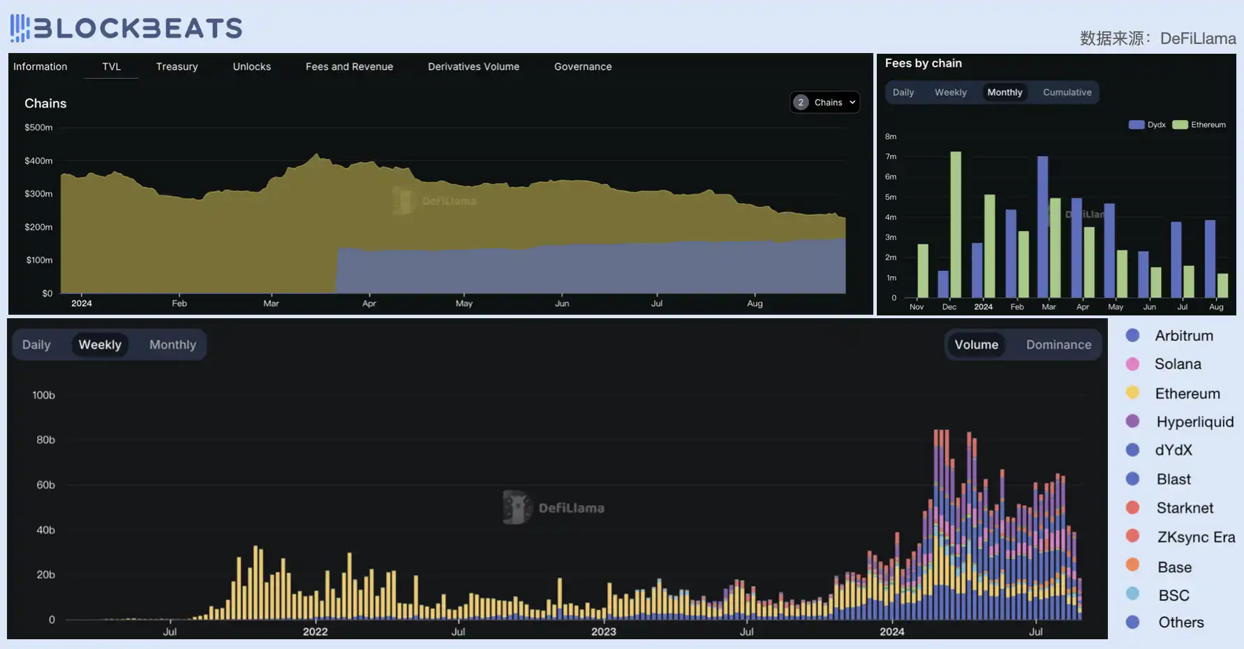 从费用来源上看,dYdX Chain 的费用已经逐步成为协议的主要收益来源,二者在 8 月所产生的费用分别为 389 万美元和 119 万美元,这表明 dYdX 的迁徙计划是成功的。但在当前衍生品协议的存量市场竞争中,dYdX 已颓势初显。从市占率上看,dYdX 不断从过去的绝对垄断地位退化下来,被 Hyperliquid、Jupiter、GMX 等新兴产品抢占了市场,目前交易量仅占 Perp DEX 总量的不到 20%。