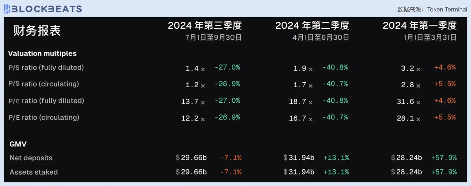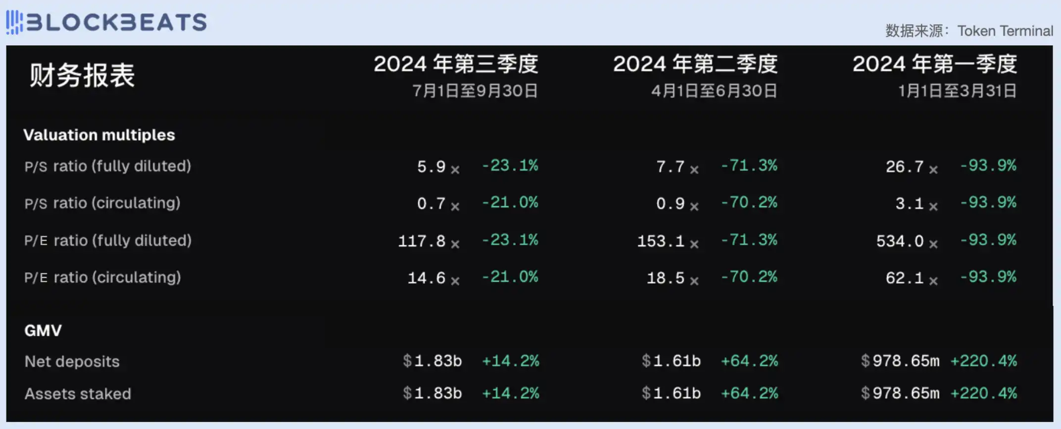但随着项目伊始阶段的红利期结束以及竞争对手的增多,市场对 Jito 的估值预期在逐渐回到正常水平。从第一季度 Solana 生态火热起势,Jito 刚刚完成空投并且上线各大交易平台,PE 值高达 534。但第二季度市场情绪趋于冷静后,Jito 的 PE 值回落至 153,目前稳定在 120 上下。但 Jito 的 GMV 也在稳定增加,目前第三季度还未结束就已经超过第二季度总额。