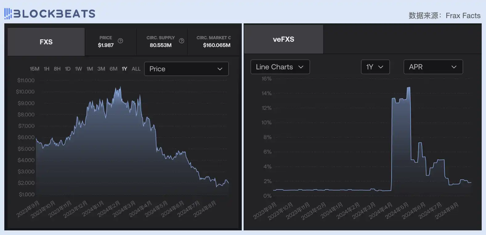 除了 Fraxtal 的努力之外,Frax Finance 还在 4 月恢复了向 veFXS 持有者分配协议费用的提议,费用开关打开后,Frax Finance 称 veFXS 质押者的收益提高了 15 倍。从数据上看,veFXS 的 APR 确实在 4 月至 5 月期间出现了显著的飙升,达到了接近 16% 的高点。但很快急剧下降,目前不足 2%。