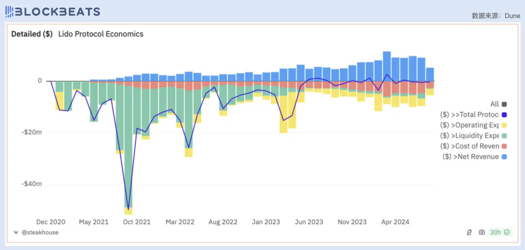 若论财报,Lido 或许是 DeFi 领域「最好看的」,由于收入来源直接来自 PoS 释放,Lido 依靠规模效应持续创造着可观的利润回报。目前,Lido 占据整个 ETH 质押市场的 28.5%,协议收取 ETH 质押收益的 10%,截至撰稿时总计 1.75 亿美元。