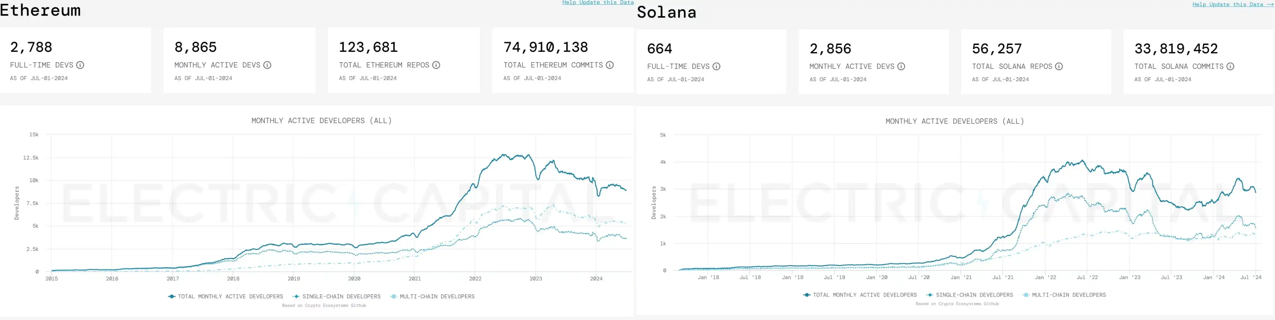 以太坊生态及 Solana 生态开发者资源和人力资本状况对比,图源来自 Electric Capital