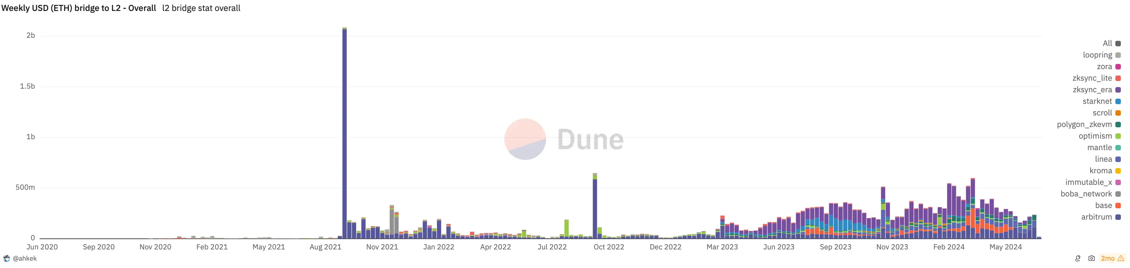 以太坊主网资金每周频繁迁向各类 L2,数据来源:Dune