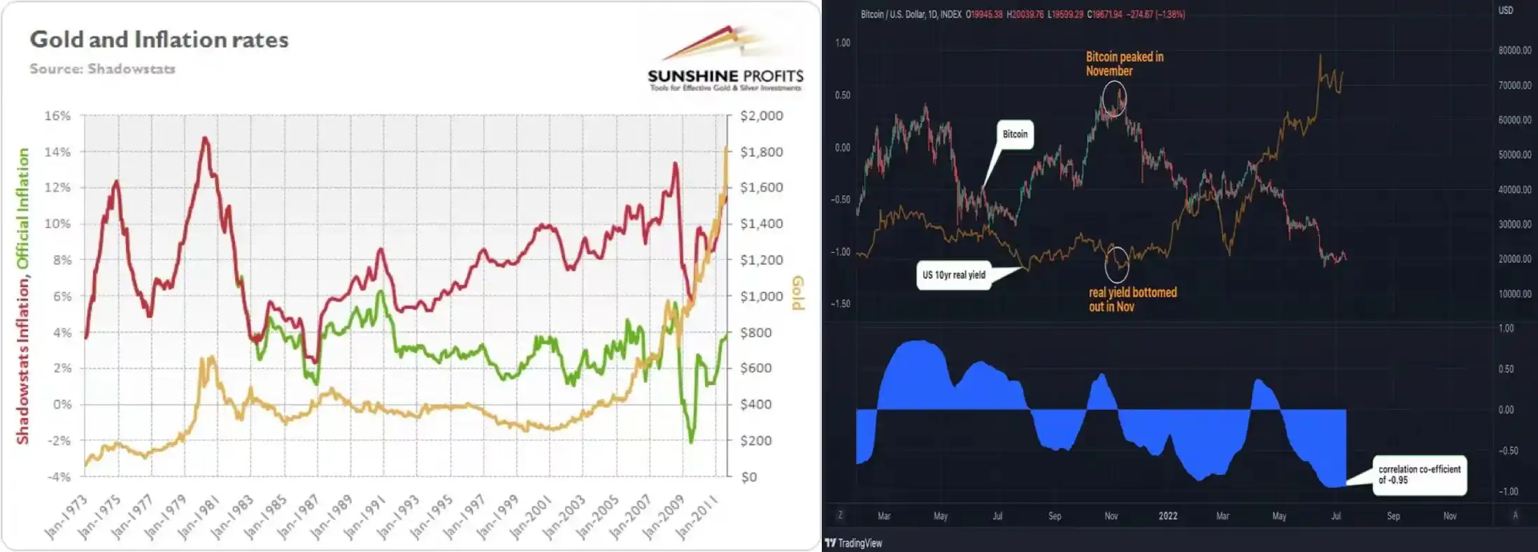 左:黄金与长期通胀相关性,图源来自:GoldPriceForcast;右:比特币与十年期国债利率相关性,图源来自 CoinDesk